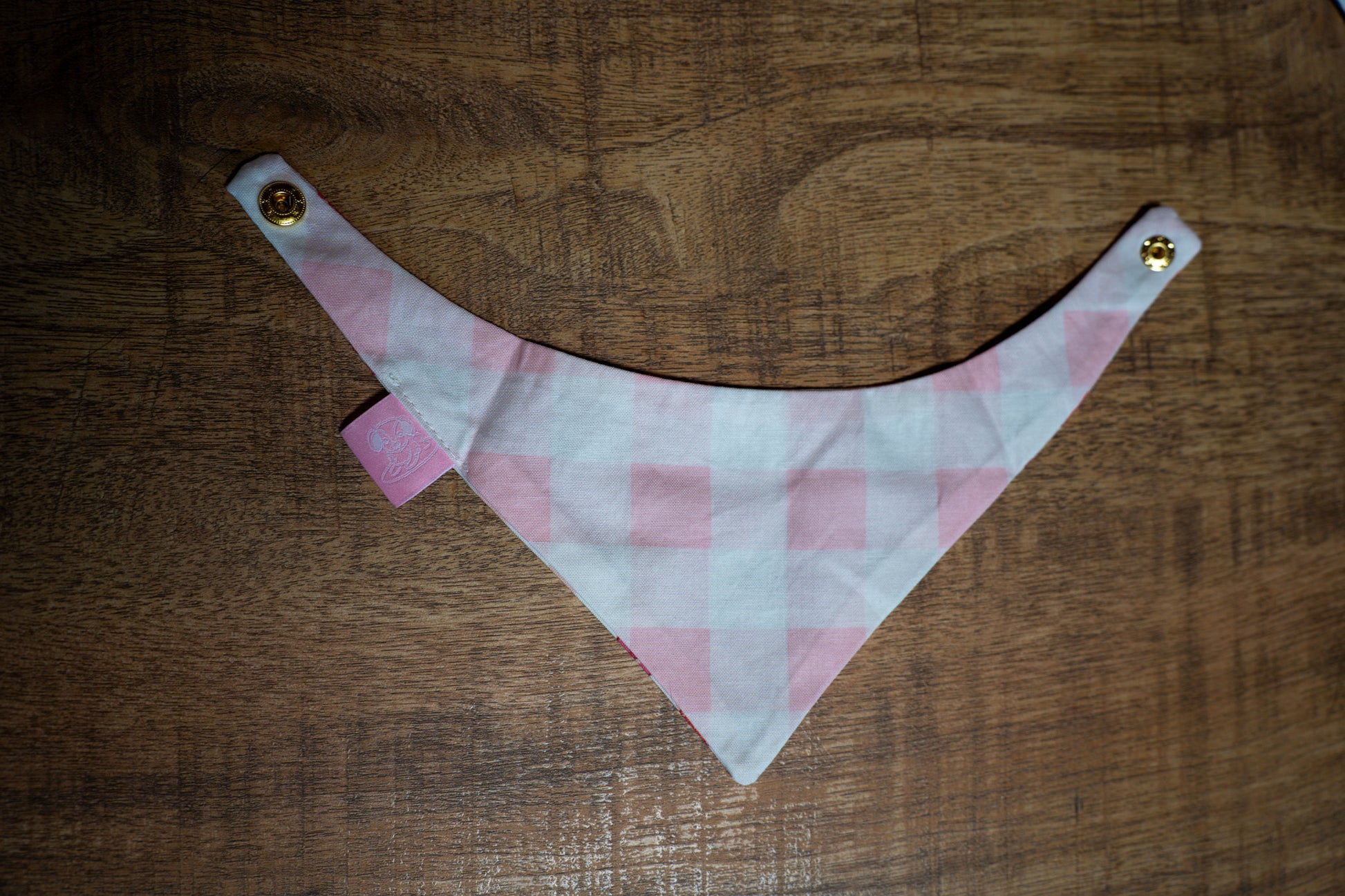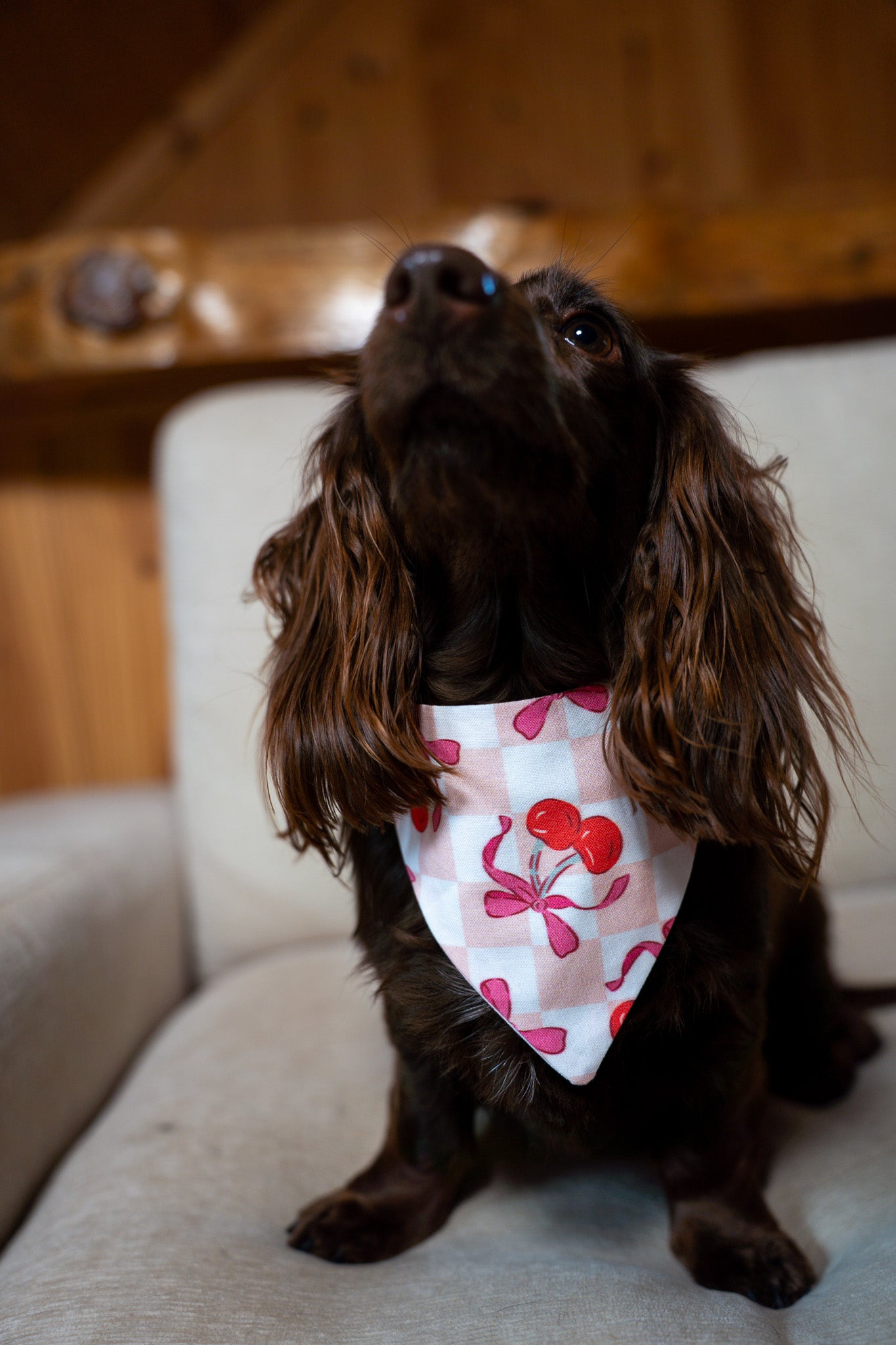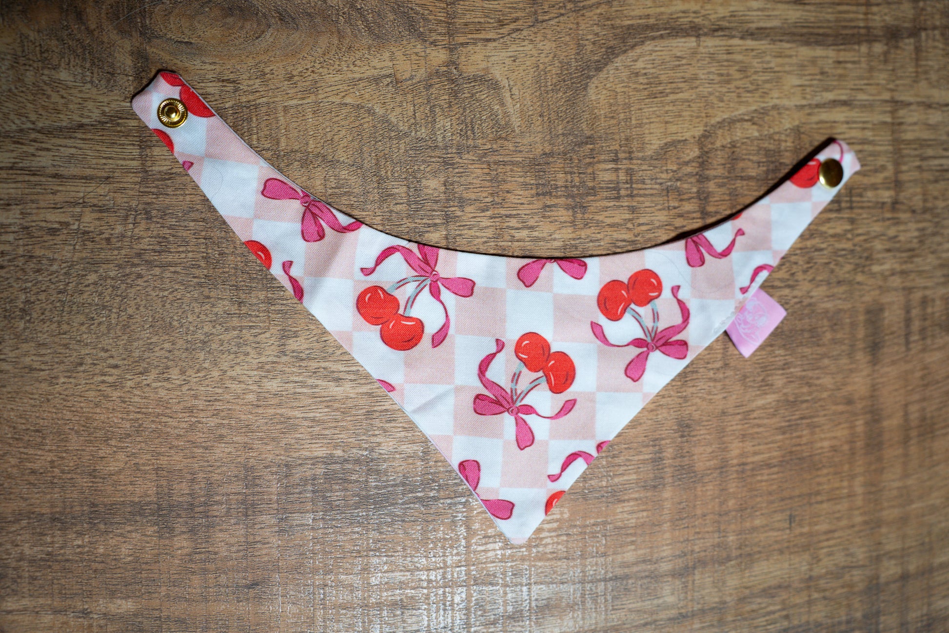 Sweet, stylish, and just a bit dramatic- this bandana is for the pups who are always dressed to impress. With cherry bows and a pink gingham base, it's giving picnic princess. The coquette core of your pup's closet.