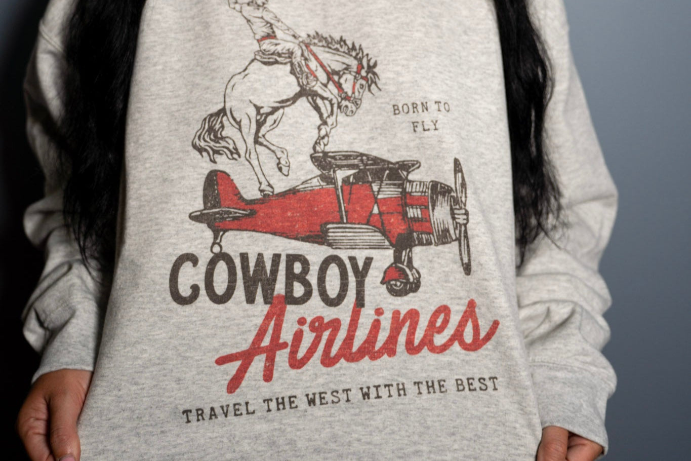 Buckle up, babe- Cowboy Airlines is now boarding. This cozy, over-sized crewneck is where the Wild West meets mile-high style.