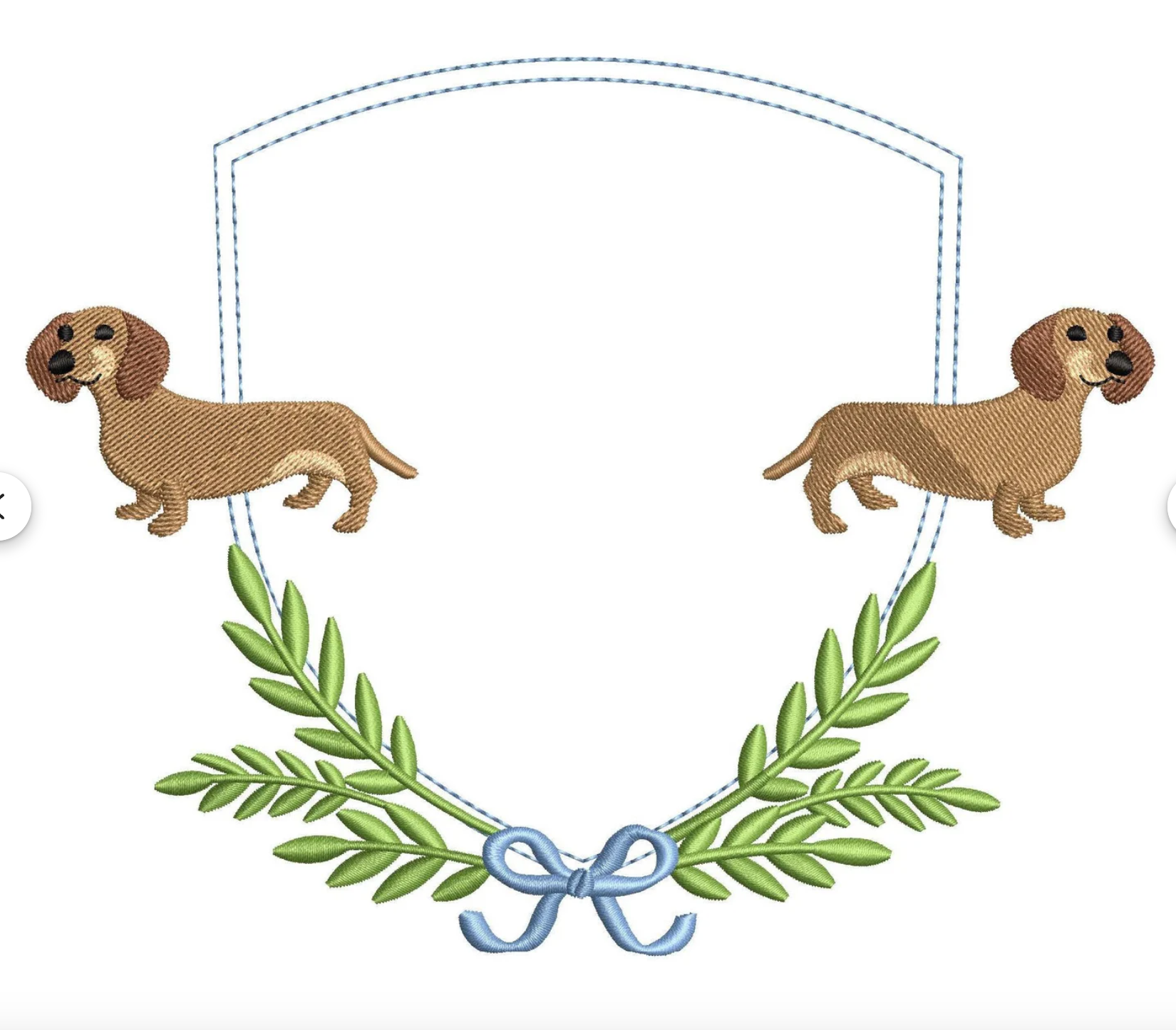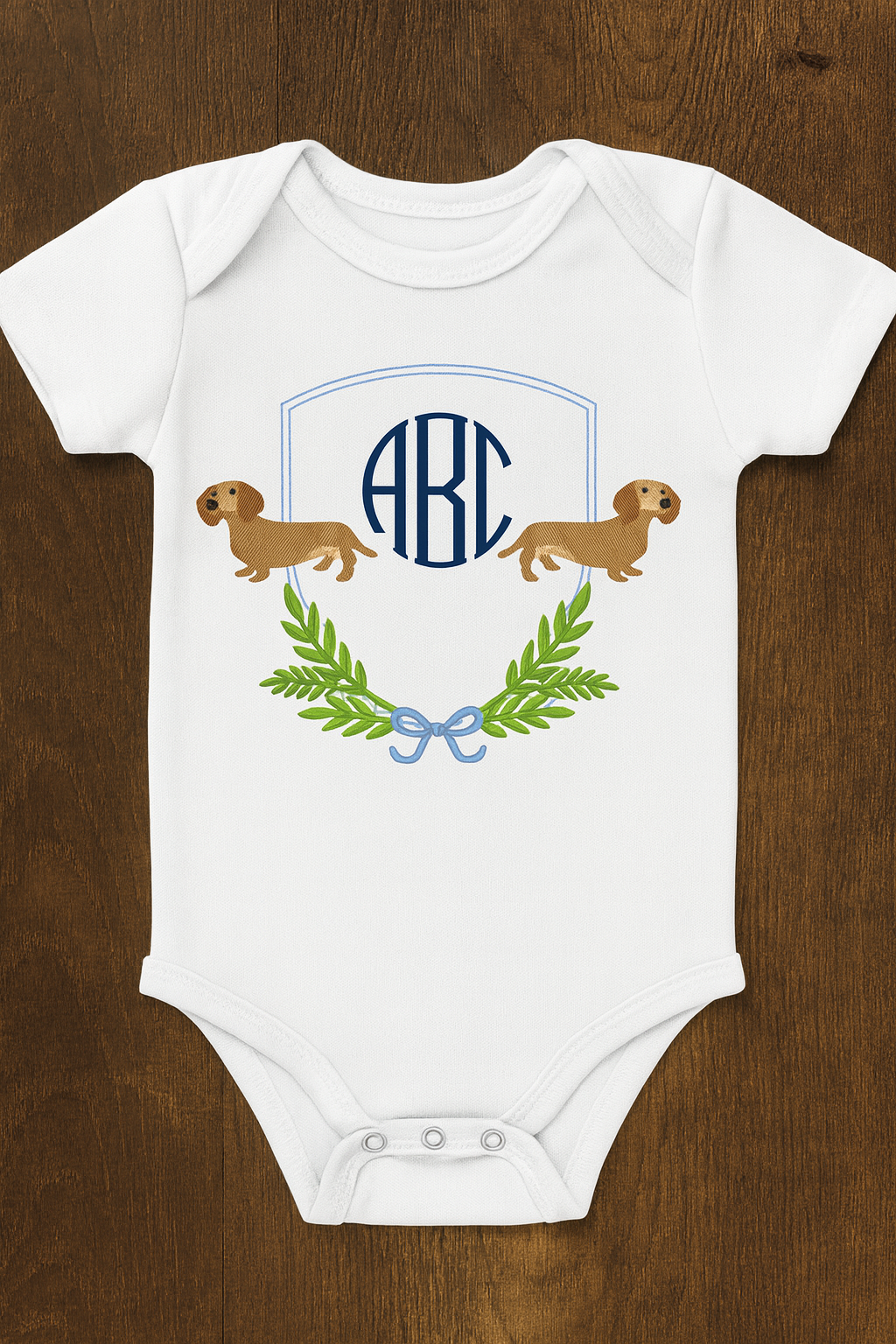 Our Dachshund Crest Monogram Onesie is the ultimate personalized piece for your little one! Featuring 2 playful dachshunds, greenery accents, and a delicate bow, this design is finished with your child's monogram centered with the crest. Perfect for baby showers, birthdays, or everyday wear, this boutique-style makes a thoughtful gift and keepsake parents will love.