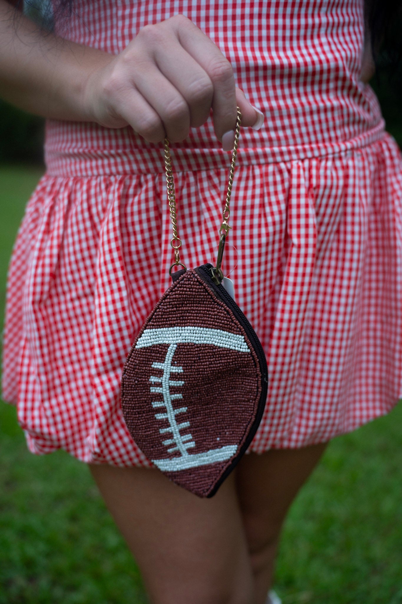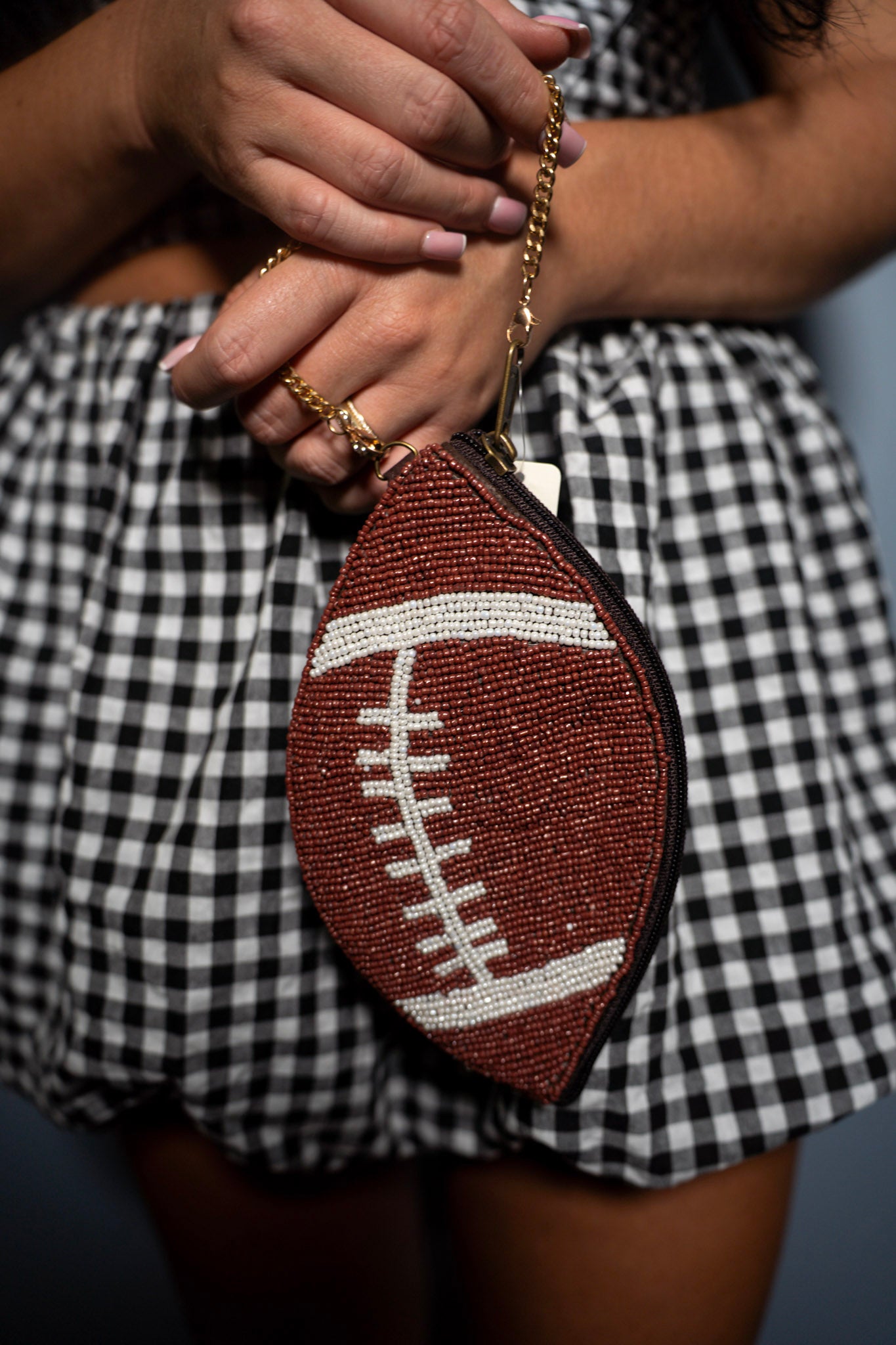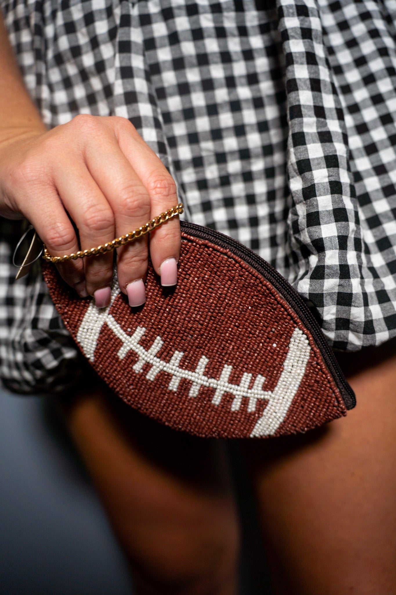 Score style points all season long with this hand-beaded football mini clutch. Featuring intricate beadwork, a secure zip closure, and a small gold chain wristlet strap, this mini bag is the perfect game day accessory. Small, but mighty, it will hold just the essentials- credit cards, cash, lip gloss. Use as a mini clutch or throw in in your purse for game day.