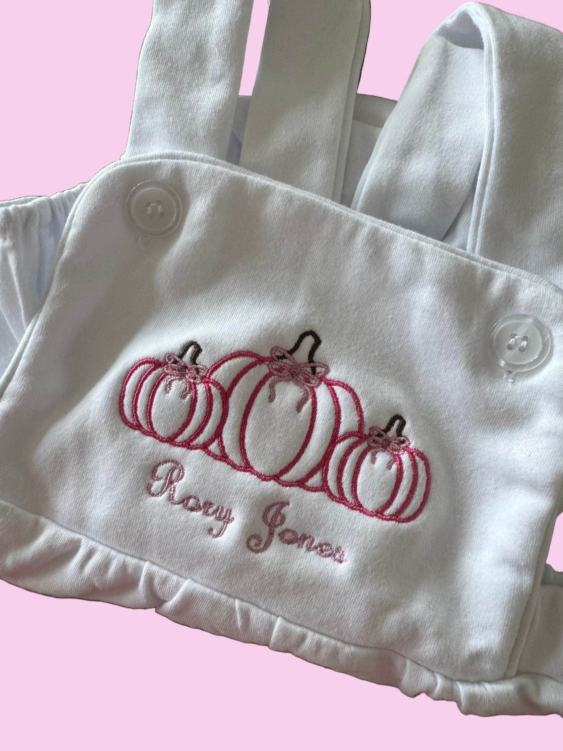 Celebrate fall in girly style with our Pink Pumpkin Patch Romper- the perfect mix of cozy comfort and seasonal sweetness. Made from soft cotton, this romper features adjustable button straps, snap closures for easy changes, and the most adorable embroidered pink pumpkins across the front. Add your little one's name for a sweet personalized touch.