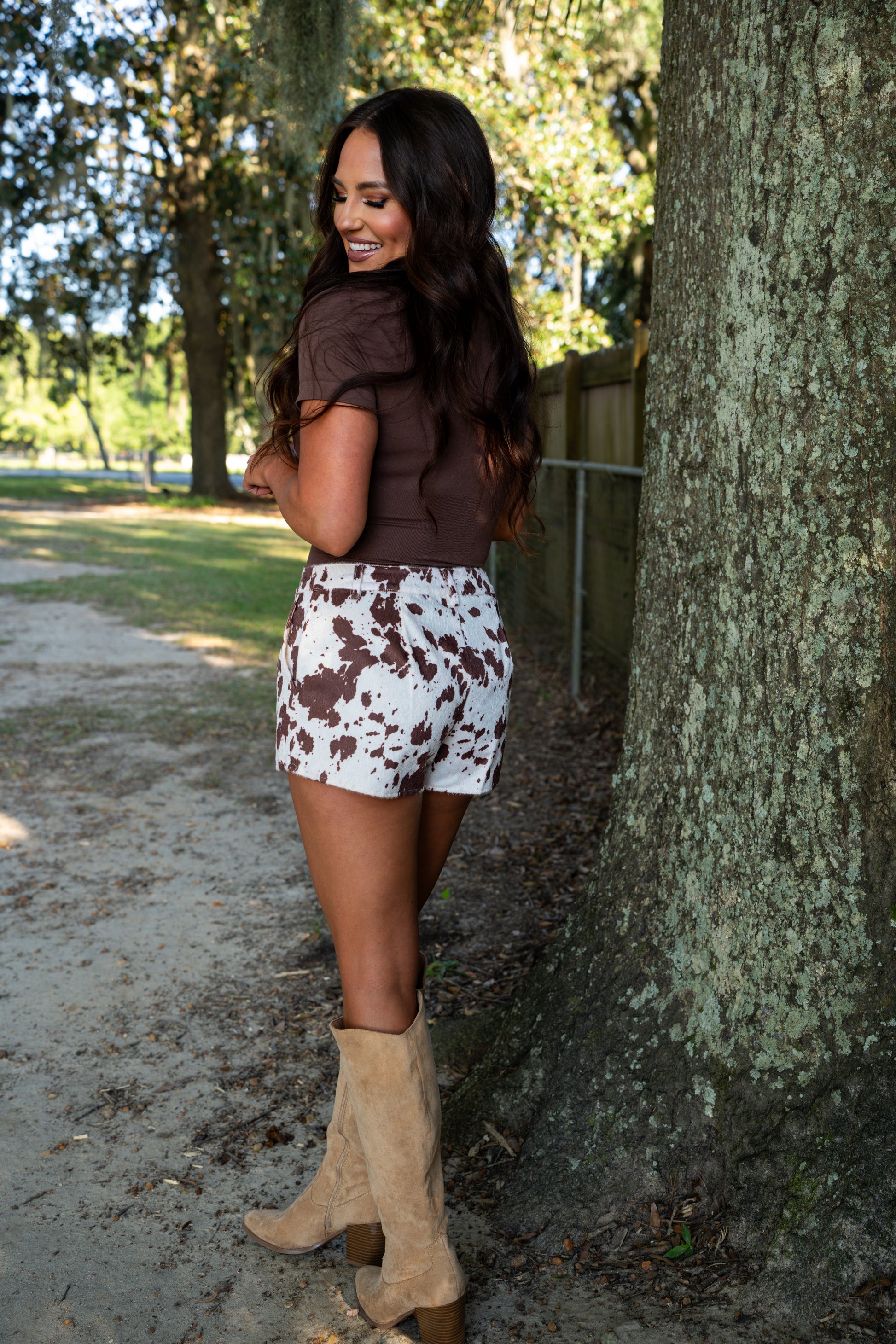 Turn heads this season in these Mid-Rise Suede Feel Cow Print Shorts. Featuring a rich cream-and-brown cow print, these shorts are designed in a flattering mid-rise fit with a soft, luxe finish that feels as good as it looks.