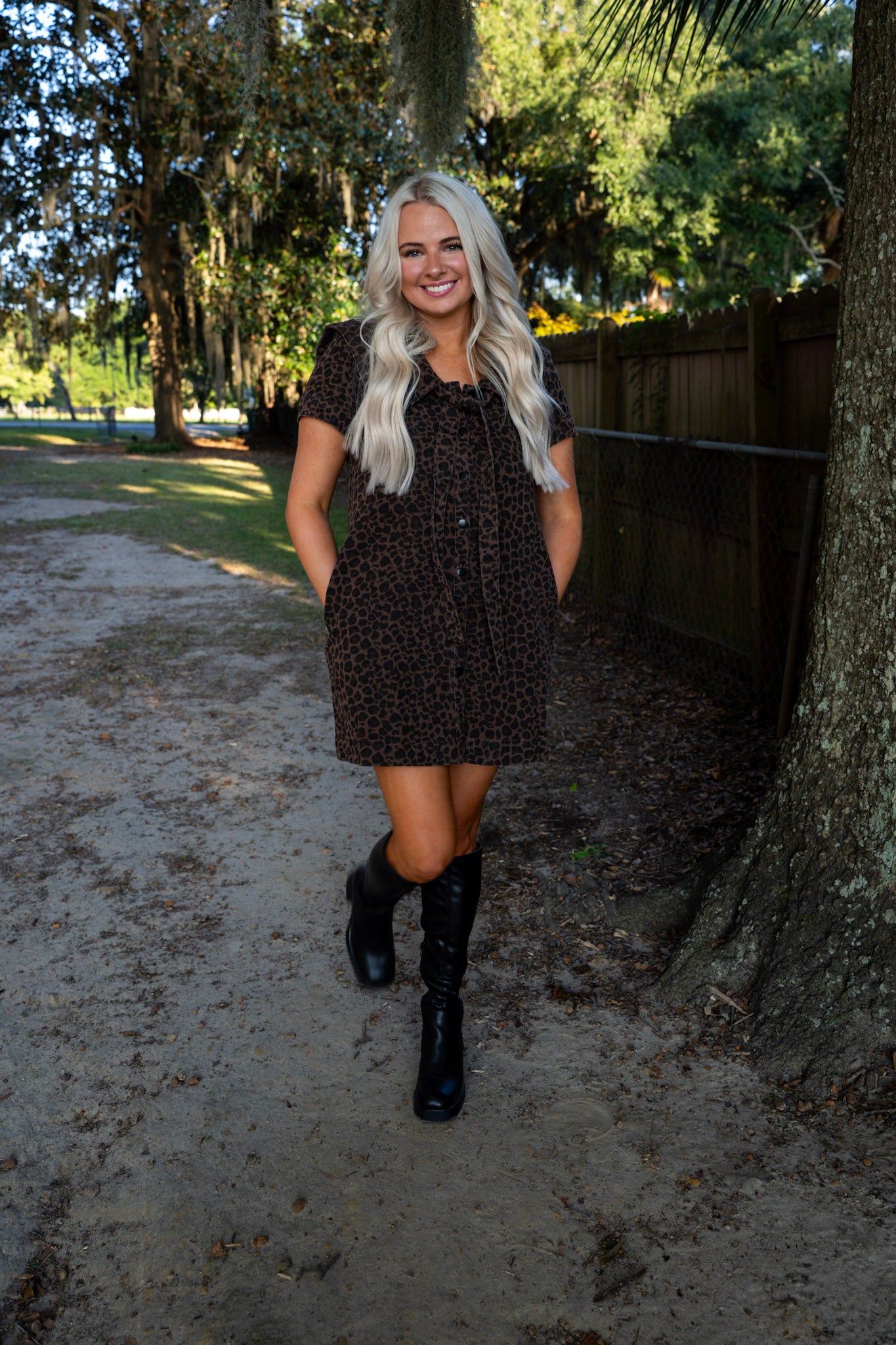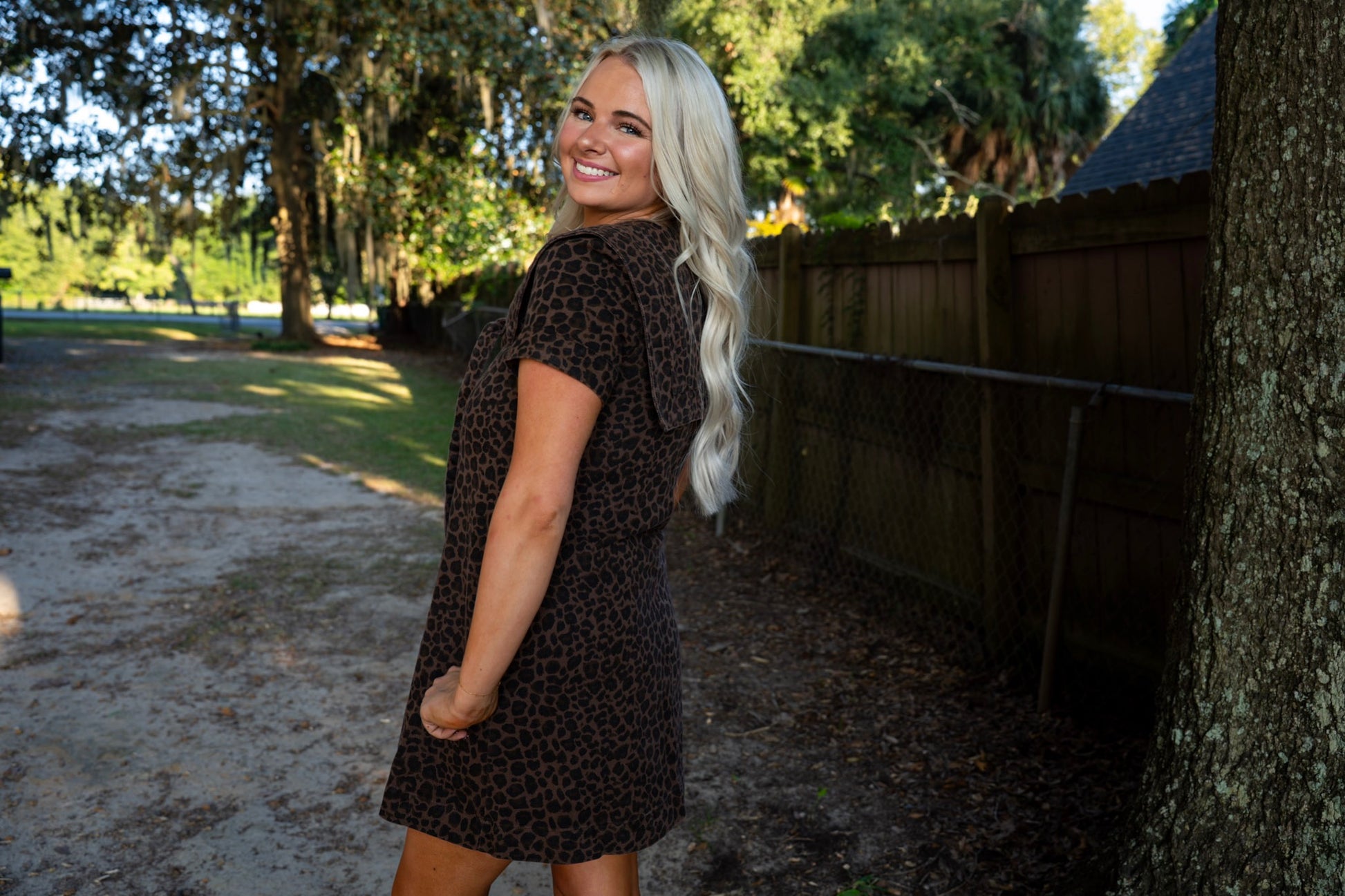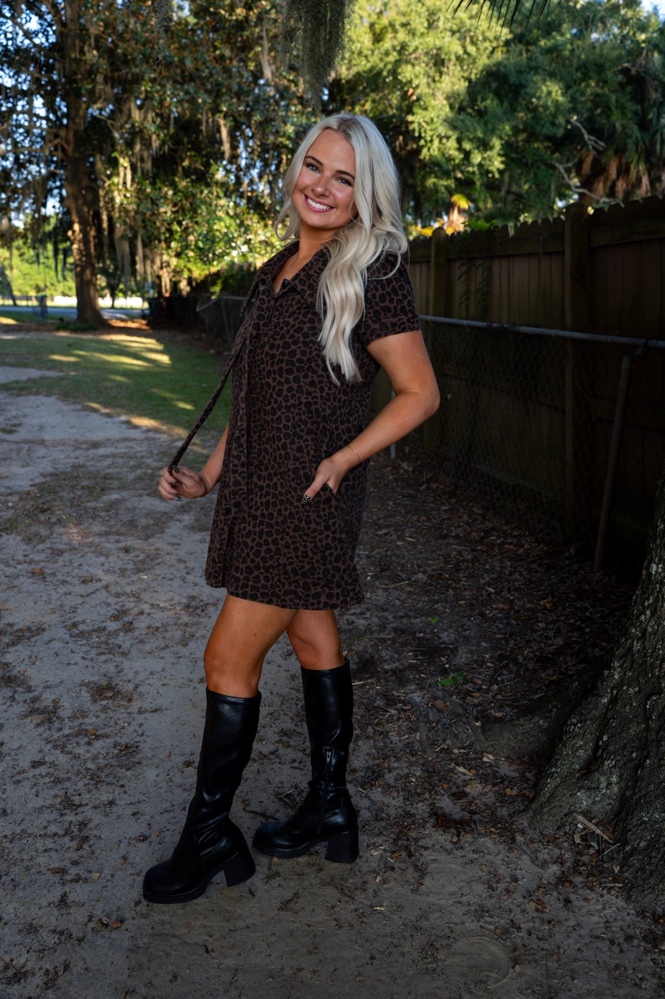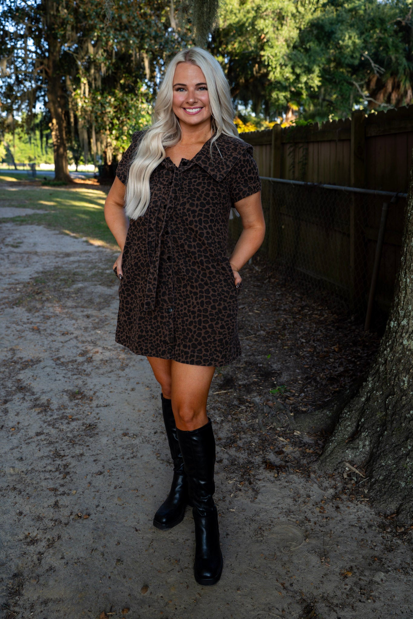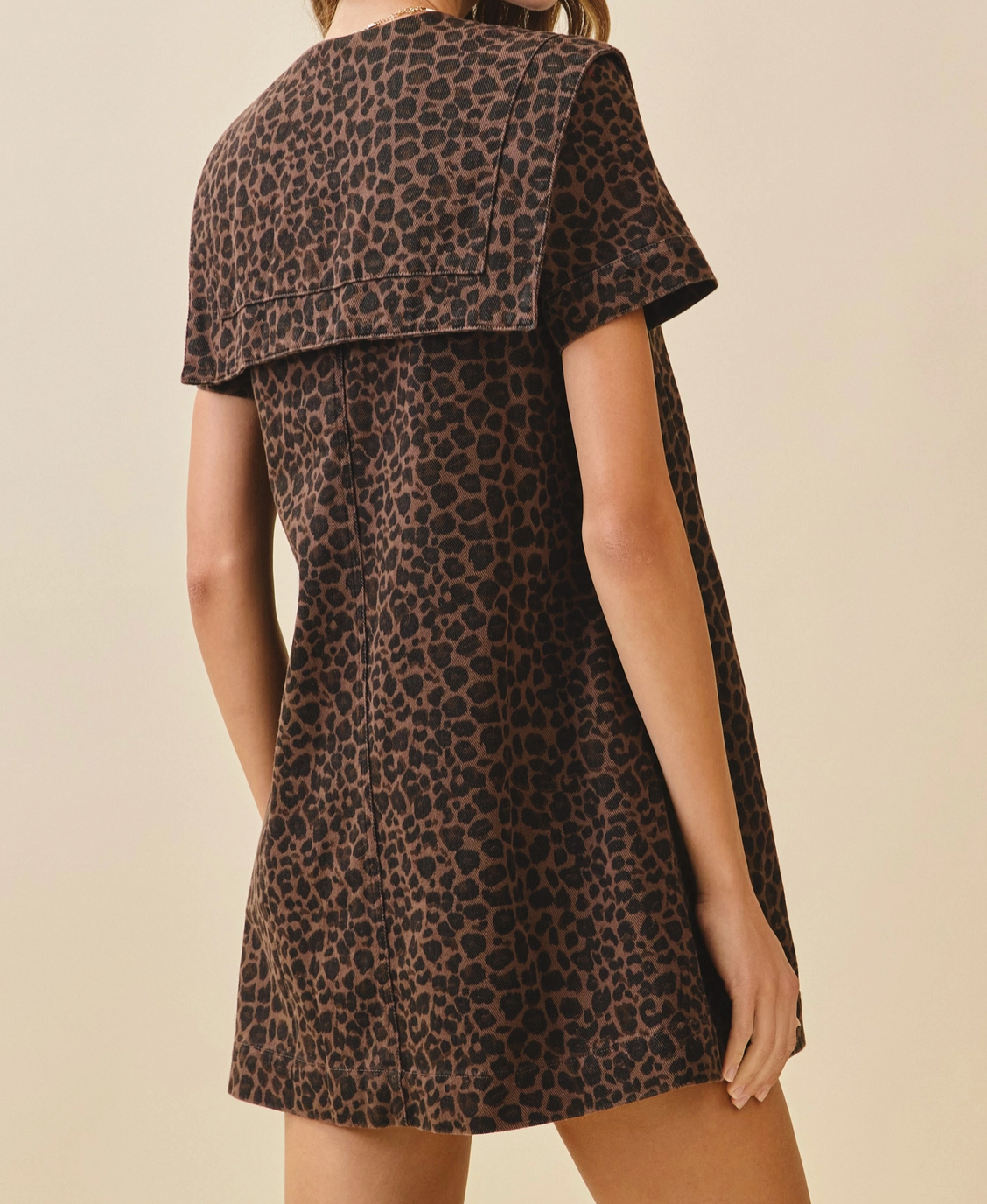 This mini dress features a bold leopard wash and an oversized sailor collar tied with a dramatic bow. Snap button front and short sleeves complete the effortlessly cool vibe.