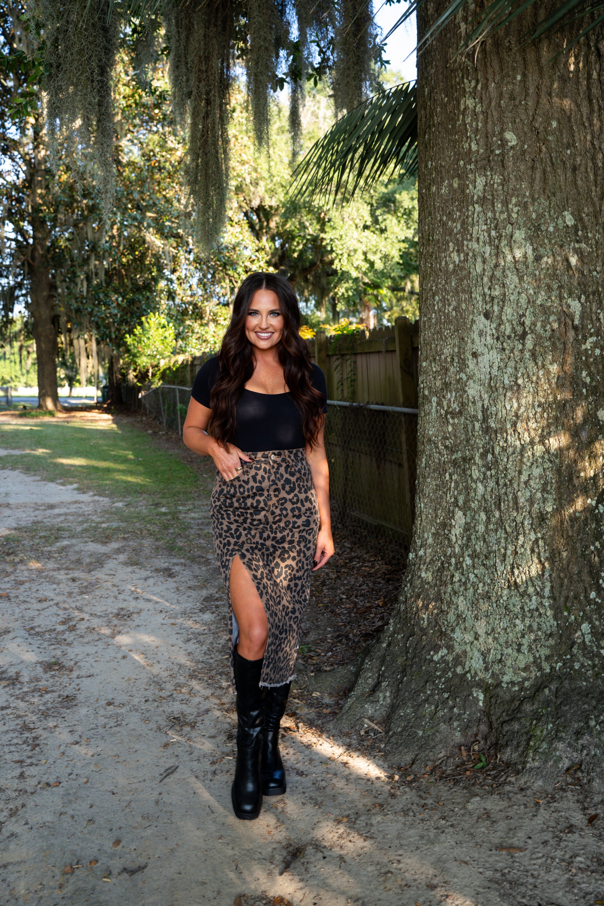 This cheetah denim skirt is what fall dreams are madeee of. Stretchy and comfortable denim featuring a slit in the front.