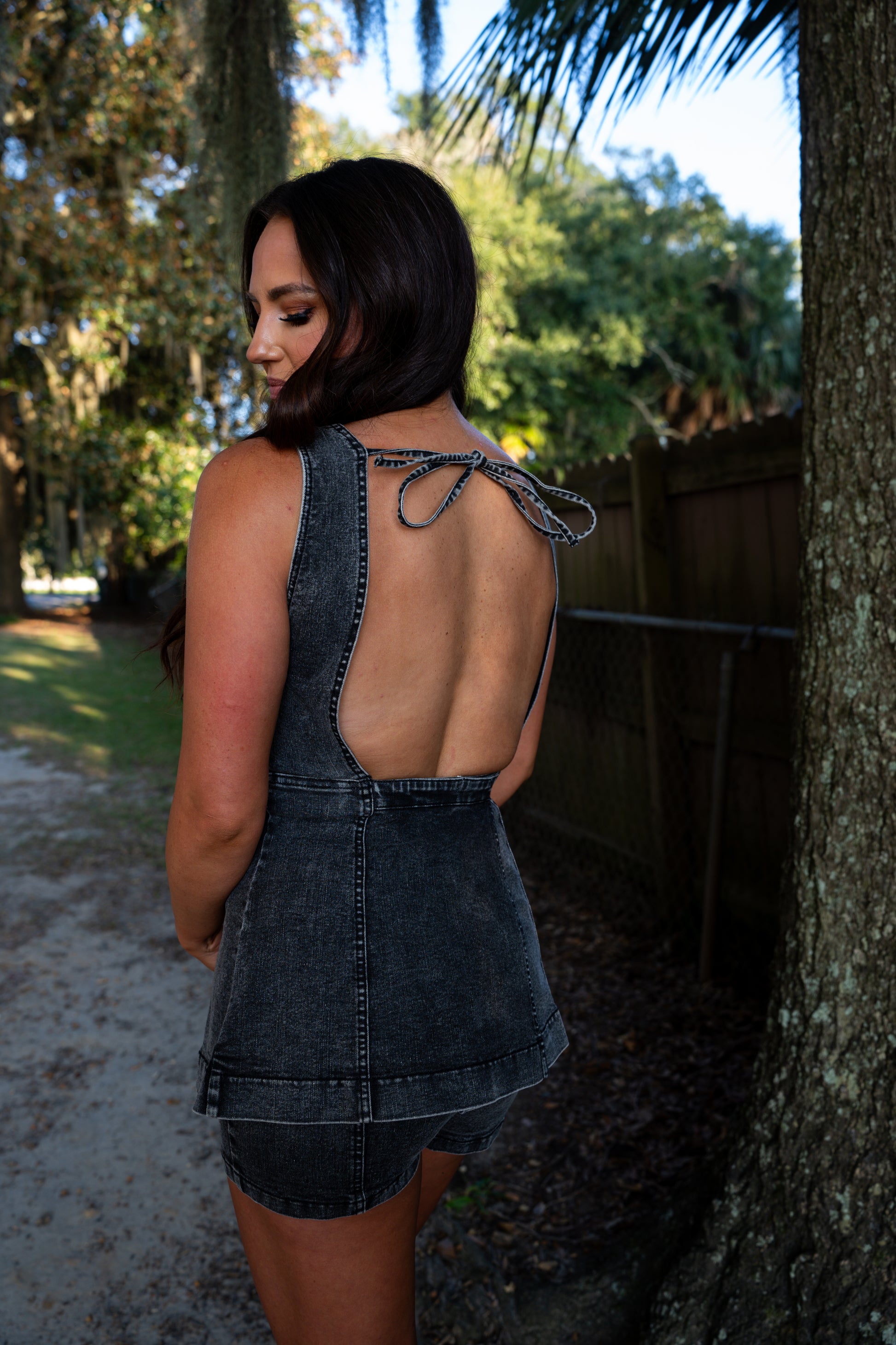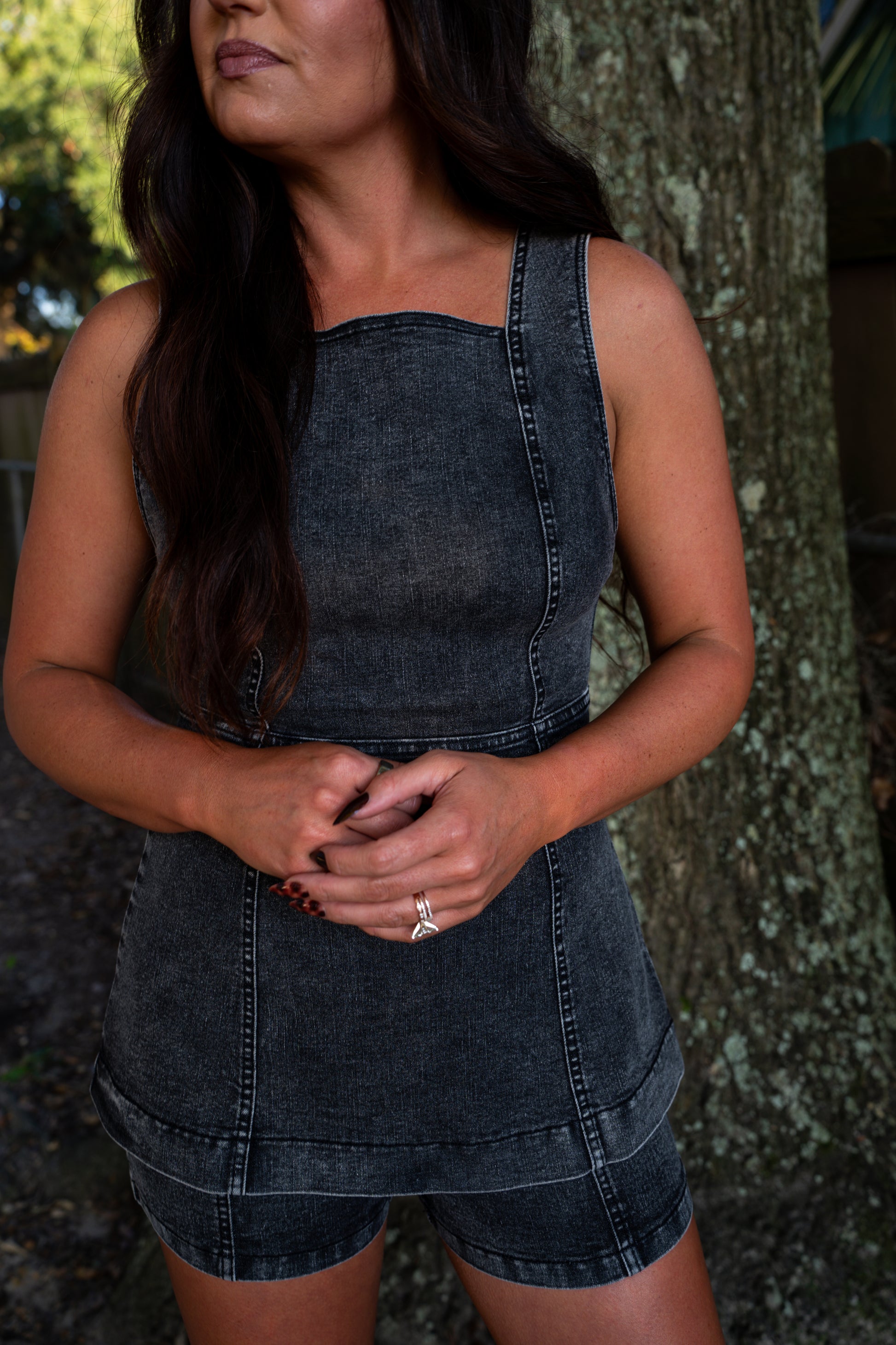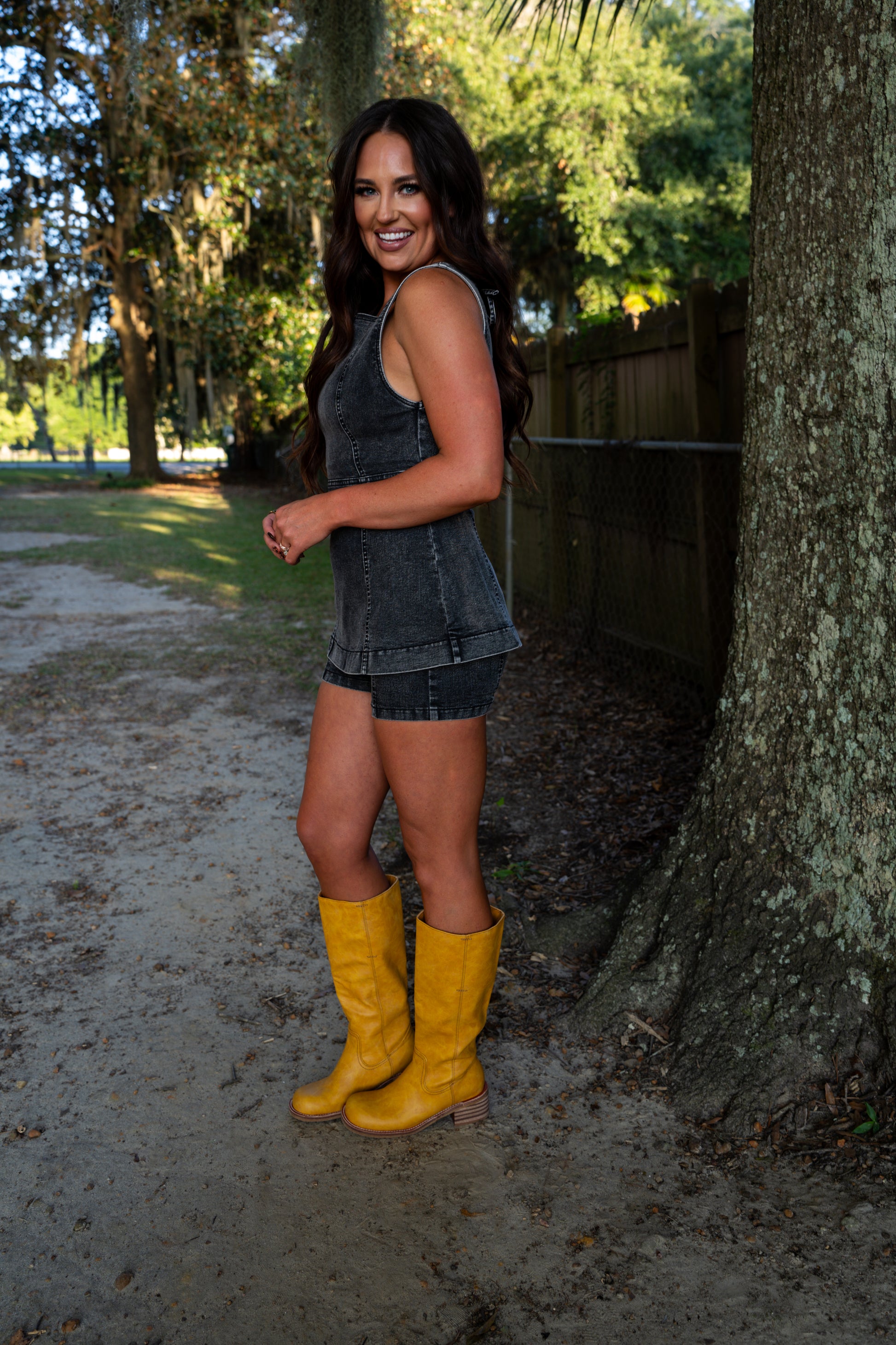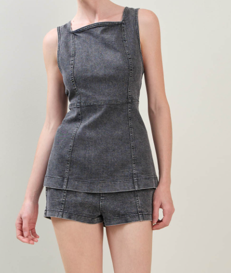 This matching denim set is giving allll the fall vibes. The sleeveless tunic top + mini shorts combo is perfect for concerts, game days, or a night out. Designed with stretch denim for comfort but structured enough to hold it's shape.
